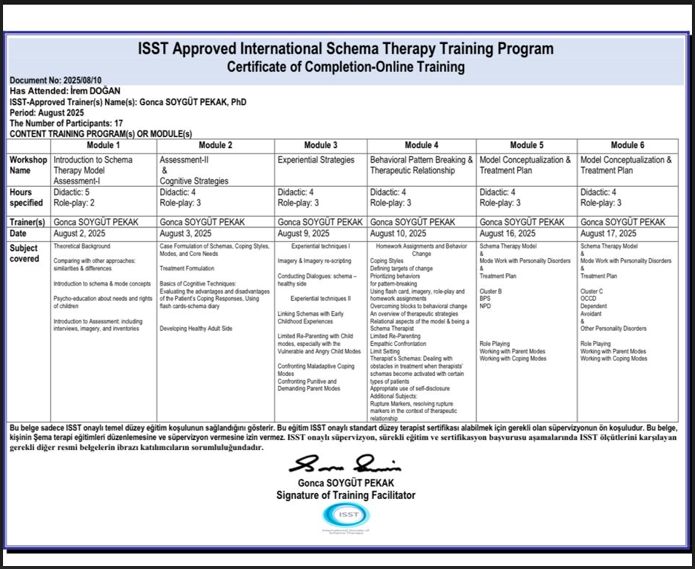 Hastanesi Ruh Sagligi ve Hastaliklari Bölümü'nde yapmistir. Yüksek lisans egitimi kapsaminda Bilissel Davranisçi Terapi teorik egitimini almistir.